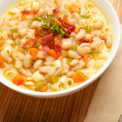 Simple and satisfying, hearty pasta and white beans get a bit of oomph from bacon, tomato, and classic Italian seasonings.